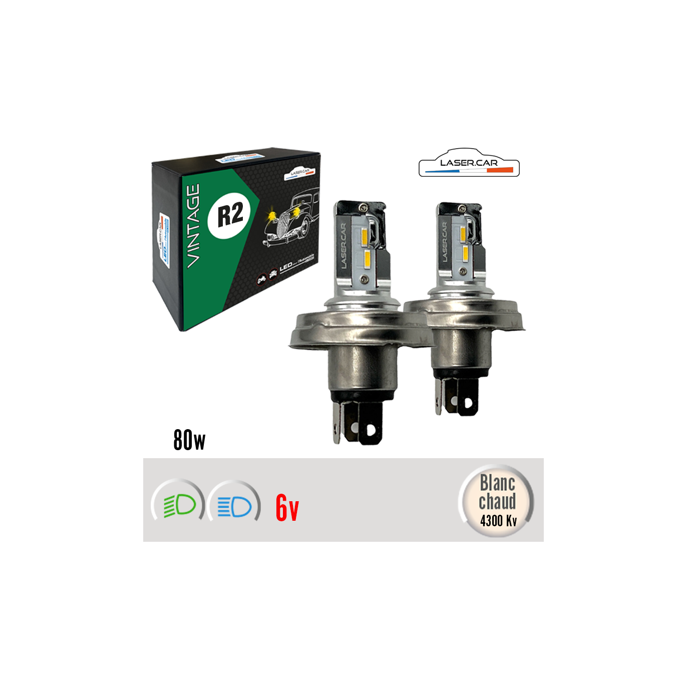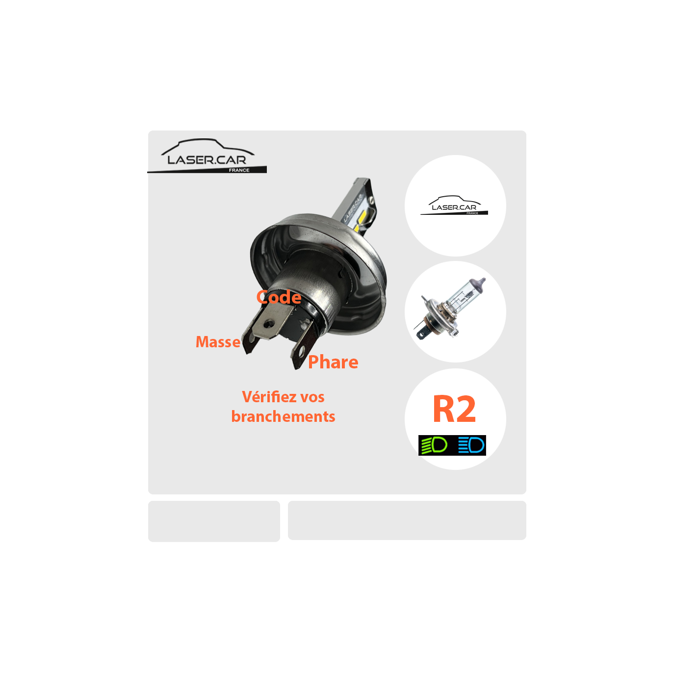 Le faisceau d'origine d'une Lampe R2 est différent d'un faisceau H4 - les R2, Code Européen, ont un faisceau asymétrique (CF:Photo) - L'usage d'un LED améliorera le faisceau en créant une rupture horizontale de 15° normalisé, et augmentera la surface lumineuse afin que les contrôles techniques soient facilités.