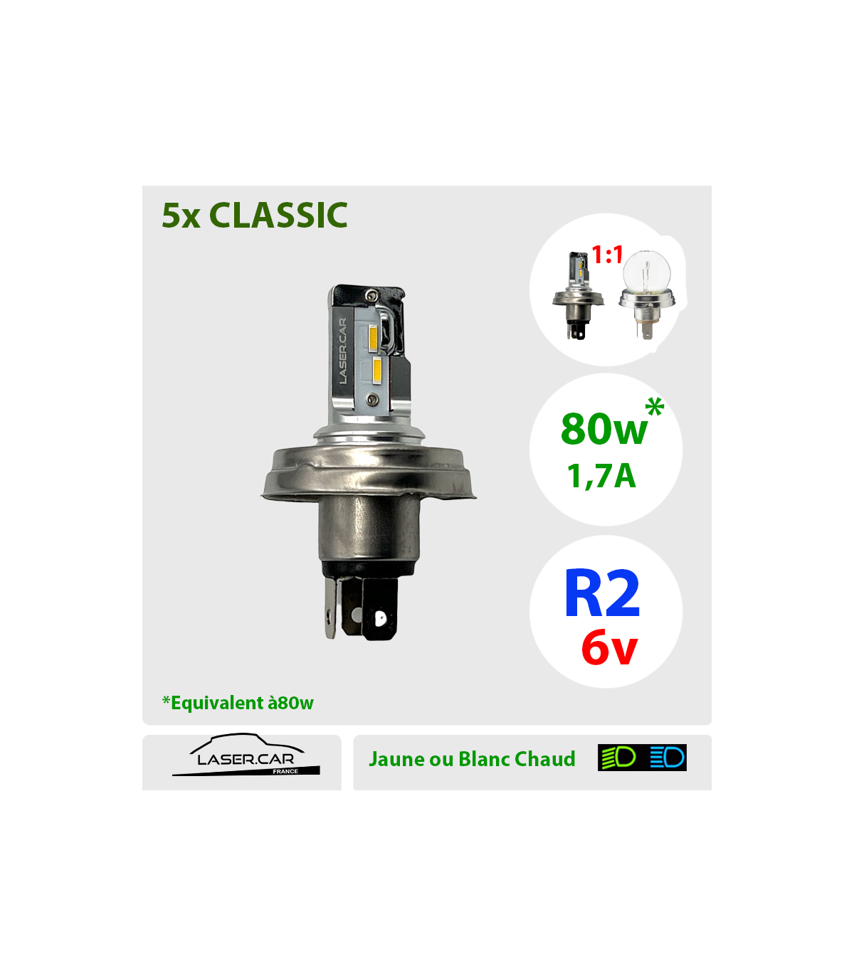 EXISTE EN 2 COULEURS : BLANC CHAUD 4300 kv ou JAUNE 2500Kv pour conserver l'aspect d'origine tout en ayant un éclairage surpuissant).