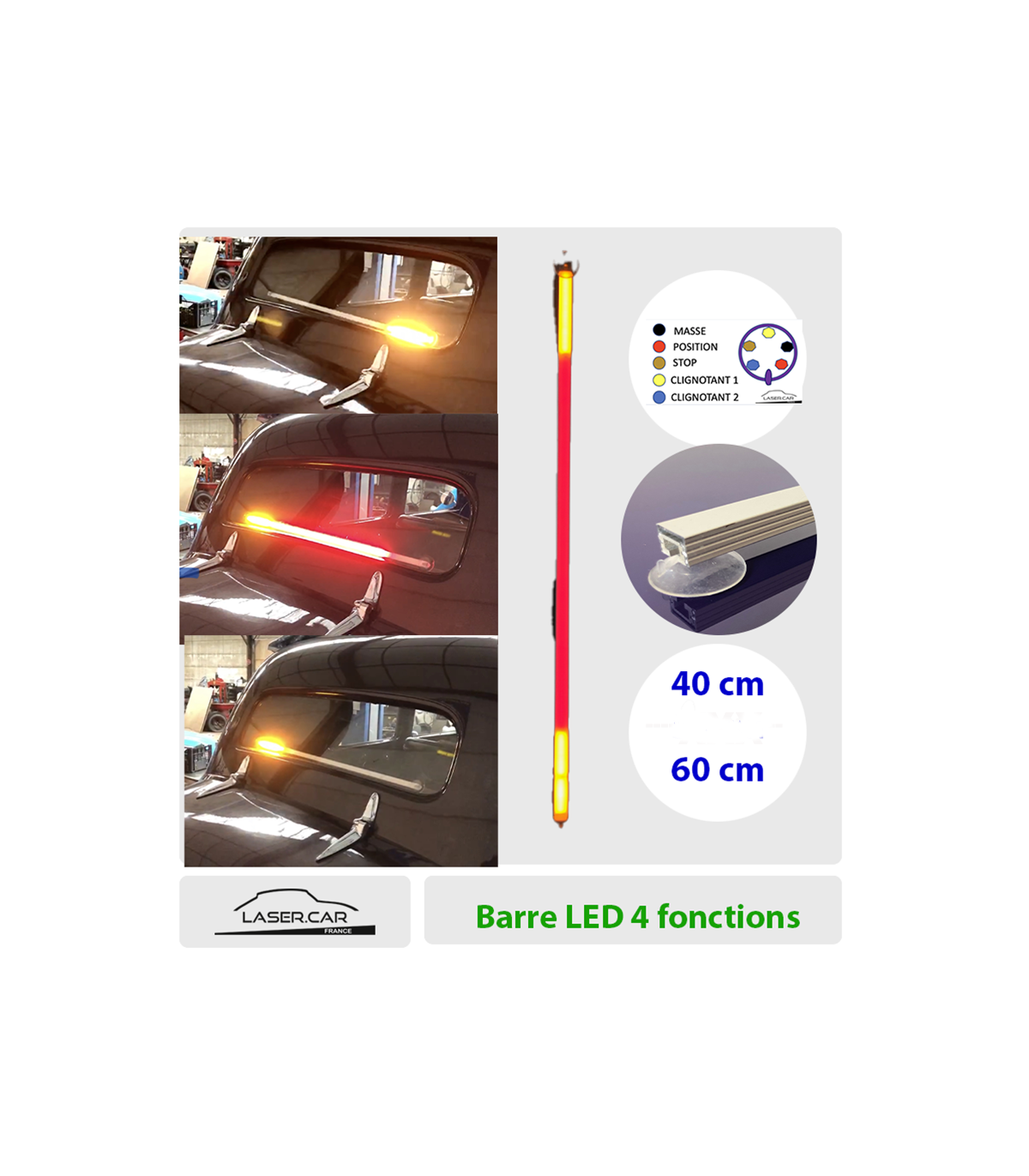Barre lumineuse de sécurité, cette création exclusive LASER CAR, est destinée à accroitre votre visibilité, en permettant aux véhicules suiveurs de vous repérer de loin, de jour comme de nuit. Elle vient en complément des équipements d'origine du véhicule, souvent mal placés ou peu visibles.